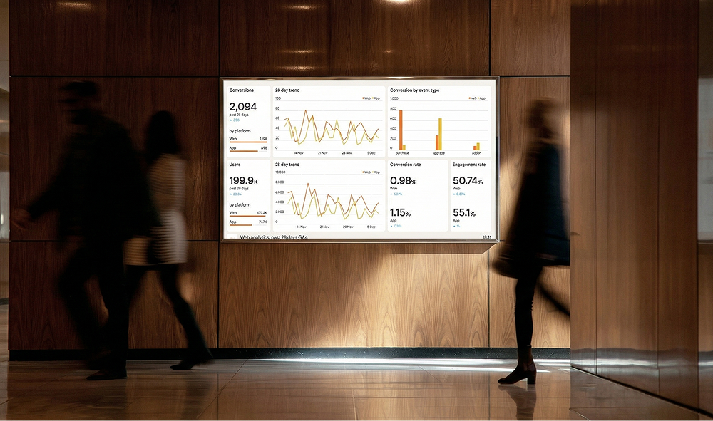 Pair your office TVs, monitors, or tablets with a simple 6-digit PIN. Push playlists and control rotation remotely from your dashboard—no extra hardware required.